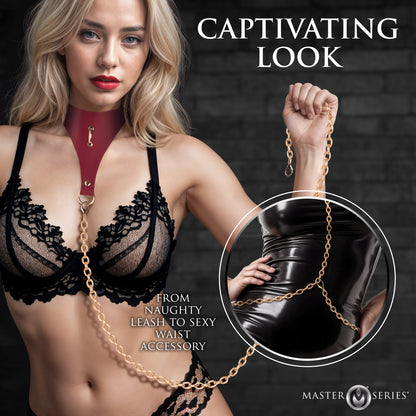 Elevate your kinky wardrobe with this sexy, vegan-leather bondage collar. Designed for ultimate comfort and adjustability, it features golden buckles to ensure the perfect fit for any neck size. This stunning collar is equipped with two D-rings — a large one at the front and a smaller one at the tip of the vegan-leather strap— ideal for attaching your favorite implements, chains, or accessories. The included detachable chain leash is perfect for guiding your submissive partner or wearing as a fashionable waist accessory. All metal components are nickel-free, making this collar not only stylish but also body-safe for everyone.