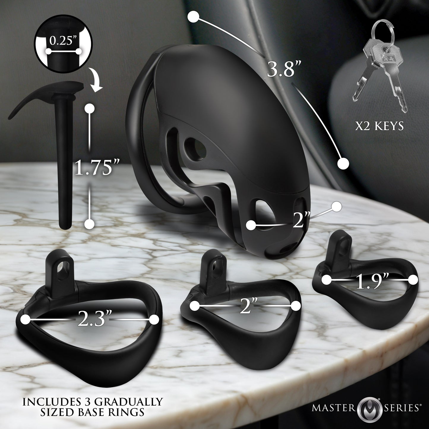 Introducing the ultimate in secure chastity with our state-of-the-art design. Strategically placed openings on the underside and sides of the cage enhance breathability, reducing discomfort. The innovative Cum-Thru Tip feature lets you stay caged longer by allowing urination. Luxuriate in the softness of our premium silicone inner lining, designed to be gentle on your skin. Find your perfect fit with three different ring sizes provided. The set includes a durable lock and two keys—one for your Keyholder and an emergency spare. Embrace comfort, security, and adaptability with this essential chastity device.