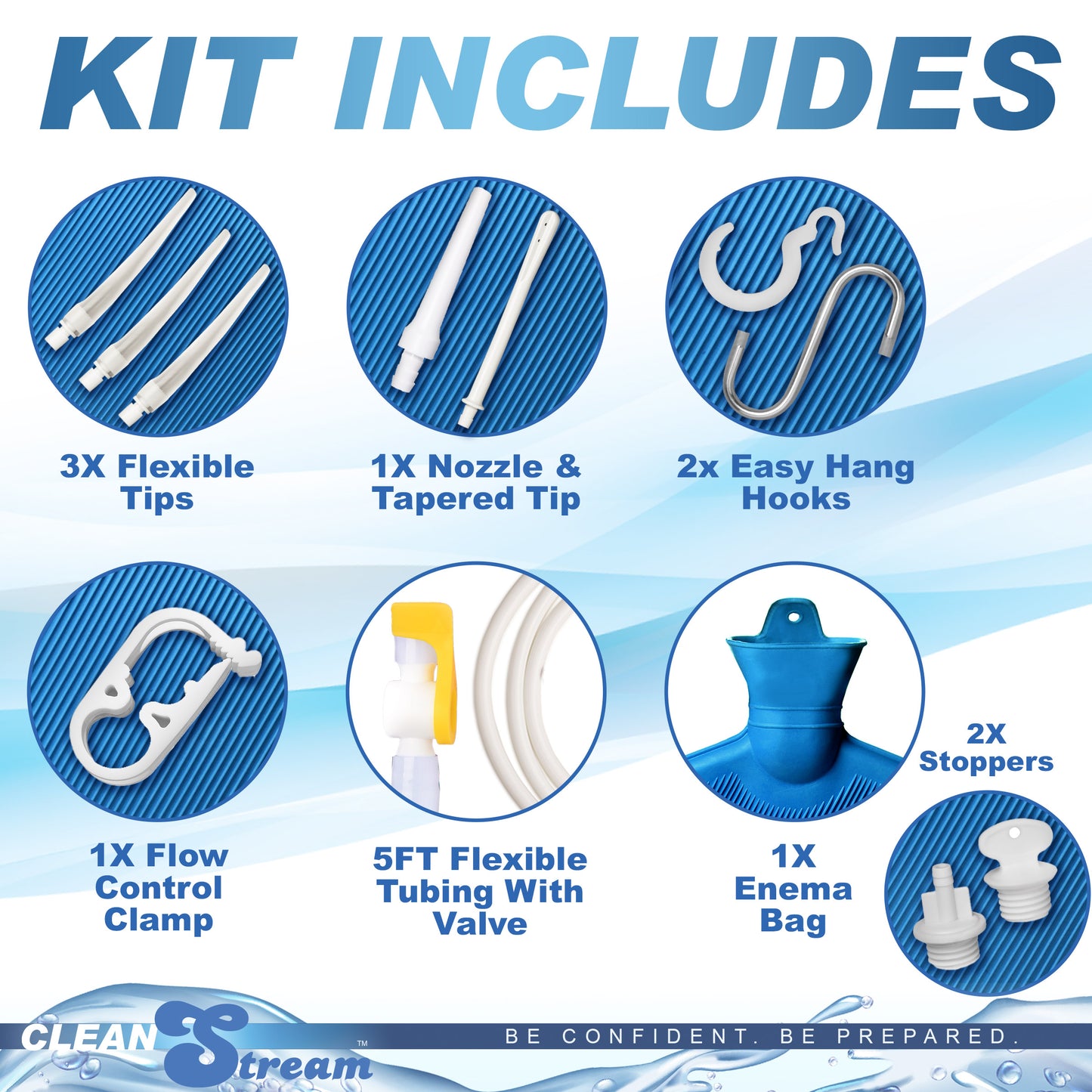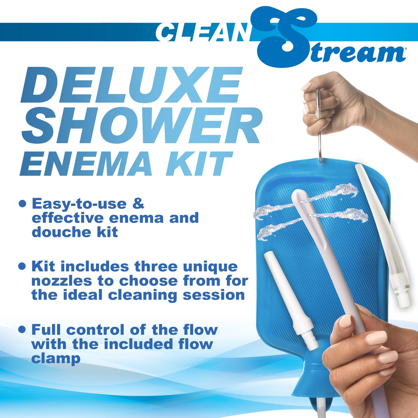 Cleanse your derriere the easy way with this Deluxe Shower Enema Kit! Feel fresher than ever before and enjoy the full feeling you get from lots of liquid adding a delightful pressure inside you. The kit has everything you need to get started and includes one 1.85L enema bag, one 5 foot tubing with flow valve, three flexible tips, one tapered tip, one nozzle tip, one stainless steel hook, one plastic hook, one flow clamp, one stopper, one stopper with tubing adapter. Easily control the water flow with the control valve on the hose so you can slow it down and take it easy as you fill yourself completely. Everyone has their preferences; find out what you like as you explore different tips! Choose between flexible, tapered and nozzle tip. As it hangs above, you can enjoy coffee enemas, salt-water enemas, or simply a warm water cleanse for both health and pleasure! Keep yourself fresh and cleaned out without the hassle and use it in your own shower for both privacy and comfort! All metal used is nickel-free for sensitive skin. Both plastic and rubber are predominantly used so you can safely use a silicone lube to help with smooth, slick insertion. Afterwards, wash it with warm water and soap and let it air dry.