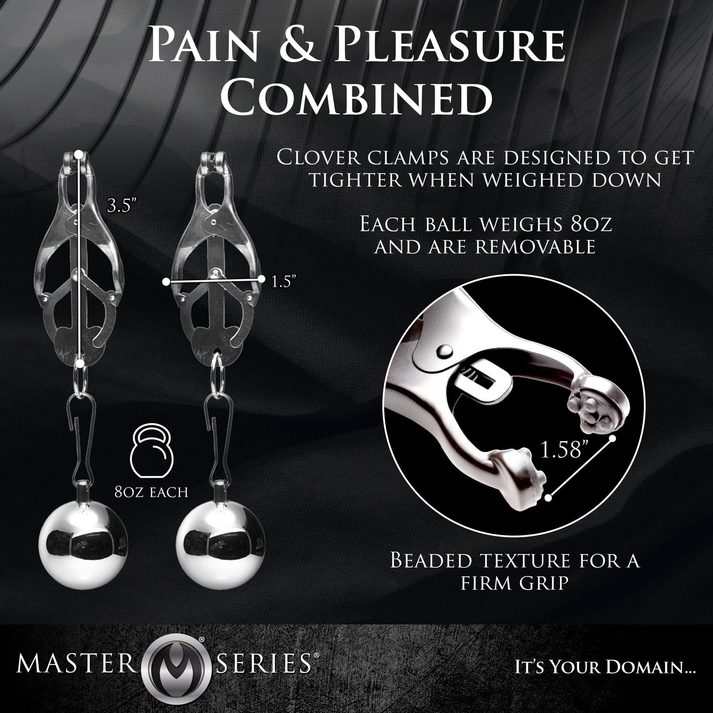 These ingenious clamps are specially designed to tighten their grip as they are pulled downward. The ends are tipped with ribbed rubber, to help retain their grip and add to the sensation. Each weight clips easily on to the end, supplying 8 oz of pull each, for a full pound of pressure total.