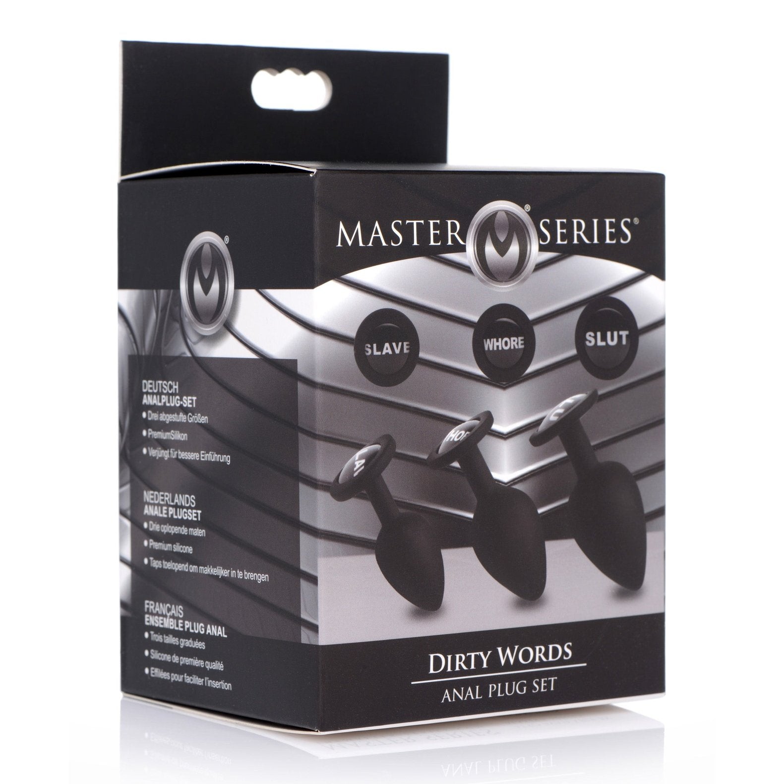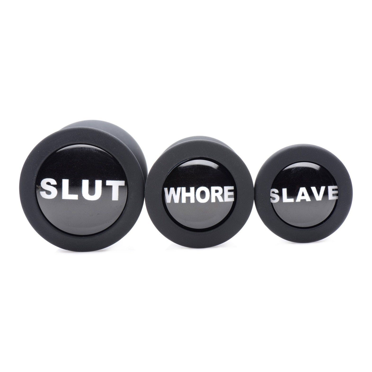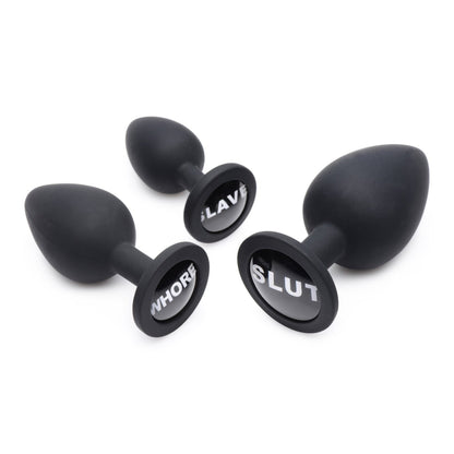 The Dirty Words Anal Plug set includes 3 different sizes of premium silicone booty accessories to train that hole! Go from backdoor beginner to advanced anal enthusiast. Each plug features a naughty name for your ass - or your playthings ass to display: Slave, Whore, and Slut! Which one will that hole be branded with? The tapered shape and smooth material make insertion easier, while the narrow stems make them comfortable for long-term wear. The high-grade silicone is non-porous and phthalate-free, but not compatible with silicone lubricants. Clean with mild soap or toy cleaner.