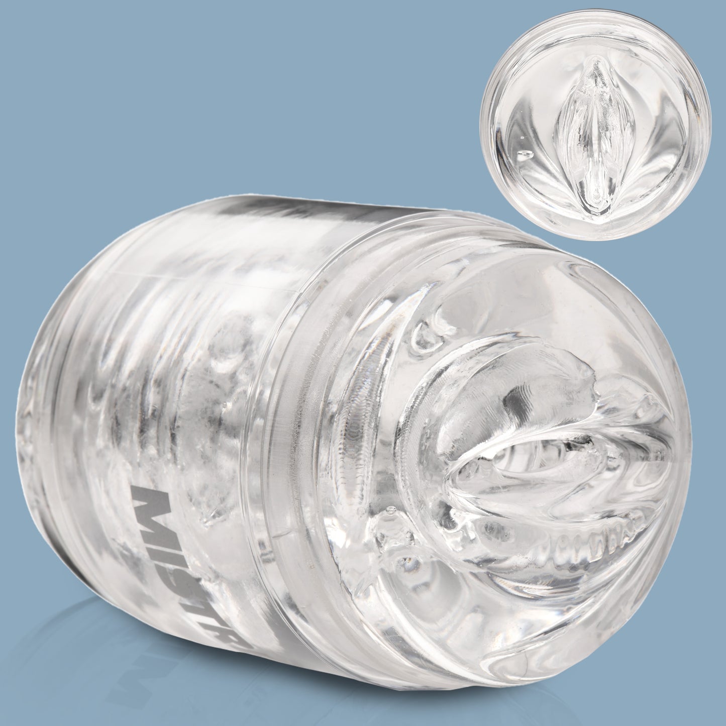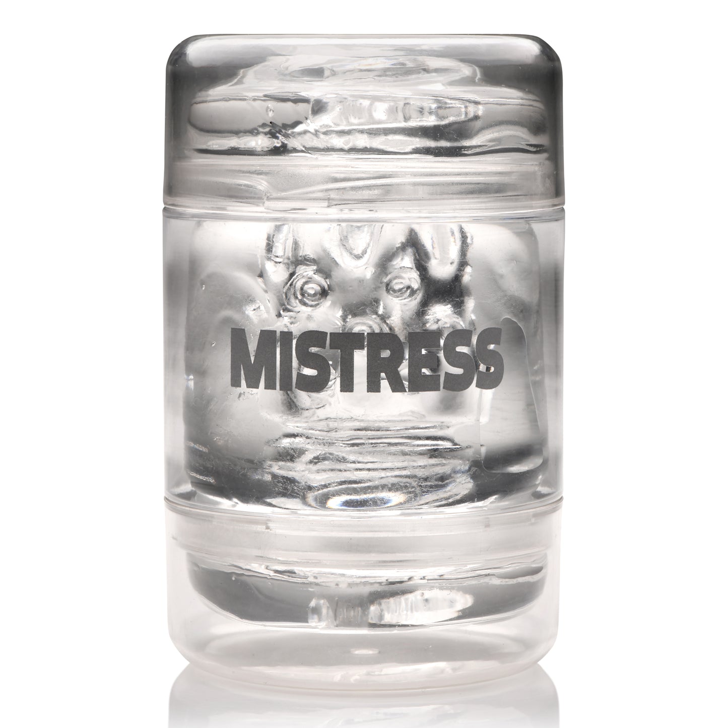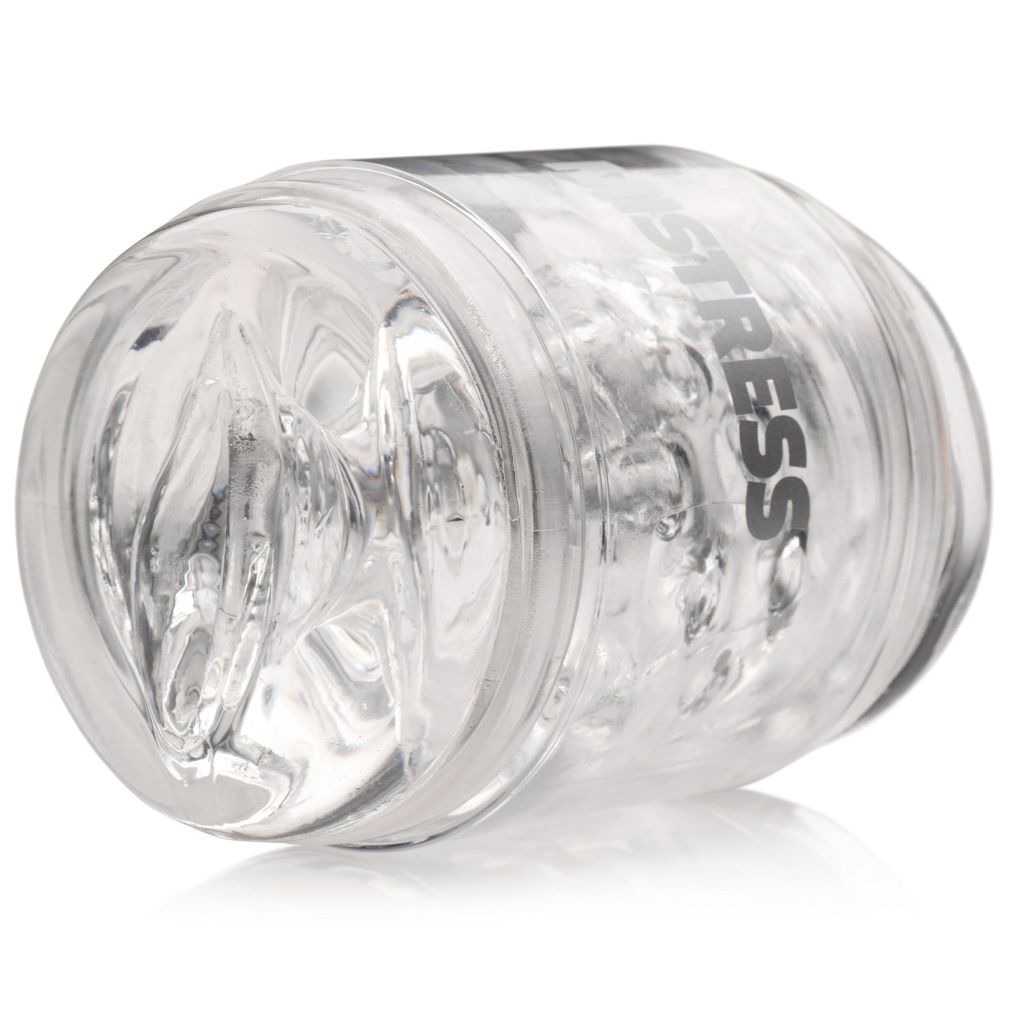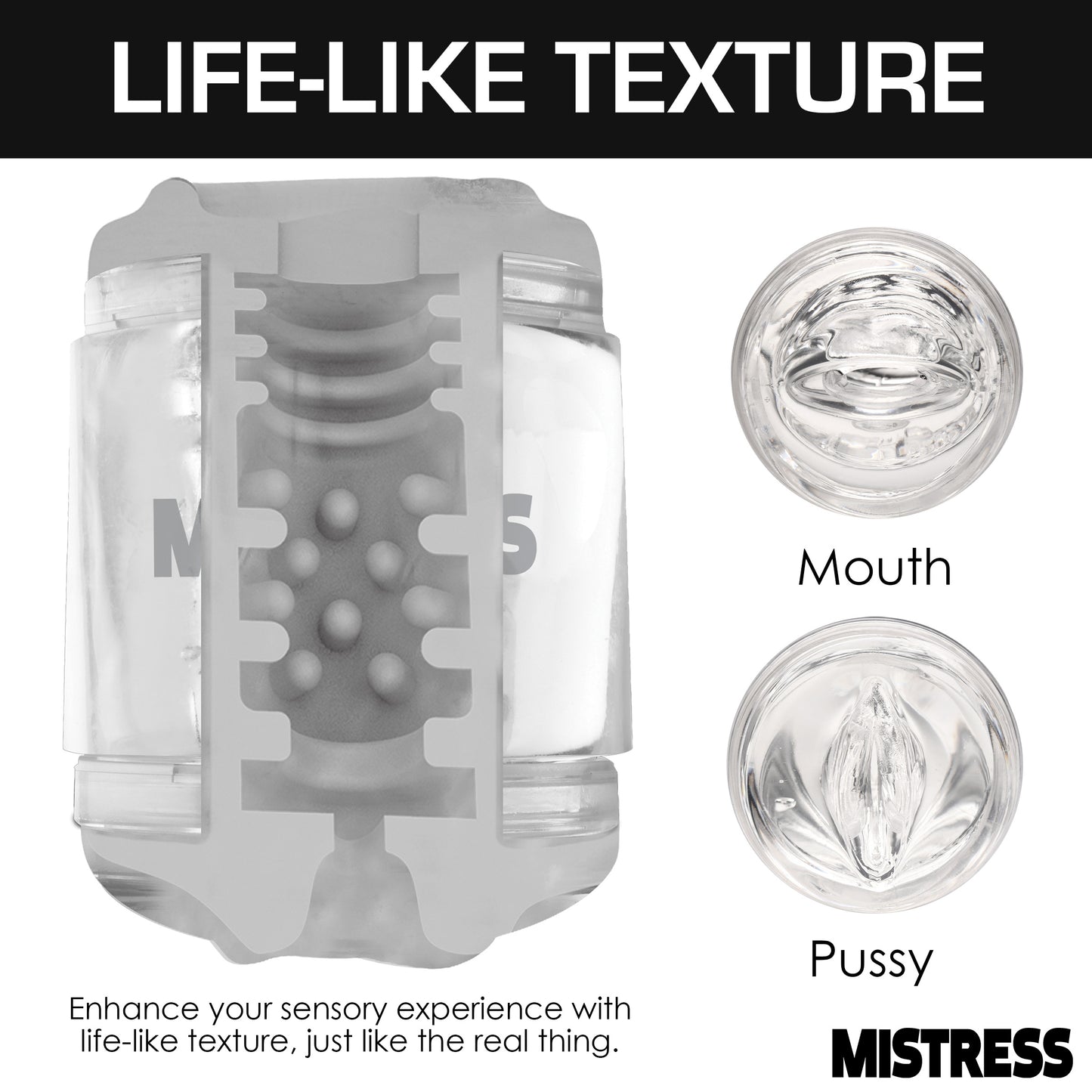 Want something a little different? This Mistress Double Shot Mouth and Pussy Stroker gives you both the feeling you're craving and enhances your experience with a clear sleeve and case! Like dipping your wick into crystal, you can see the TPE sleeve stretch and wrap around your rod with each stroke. The light catches in the squishy, soft material so your shaft can still be seen and enjoyed. Choose between the pussy or ass entrances and use the case to grip it as you use some slippery, water-based lubricant to make sure this Mistress stroke is wet enough for you. The textured sleeve will massage and stimulate you with each stroke. Keep the cap on the end for the head of your shaft to bump up on or leave it off and try to push yourself through! The open-ended design also makes clean up easy; simply rinse and let the water and mild soap run through the sleeve. After you let it thoroughly dry, place the caps on the ends to keep it dust and debris free.