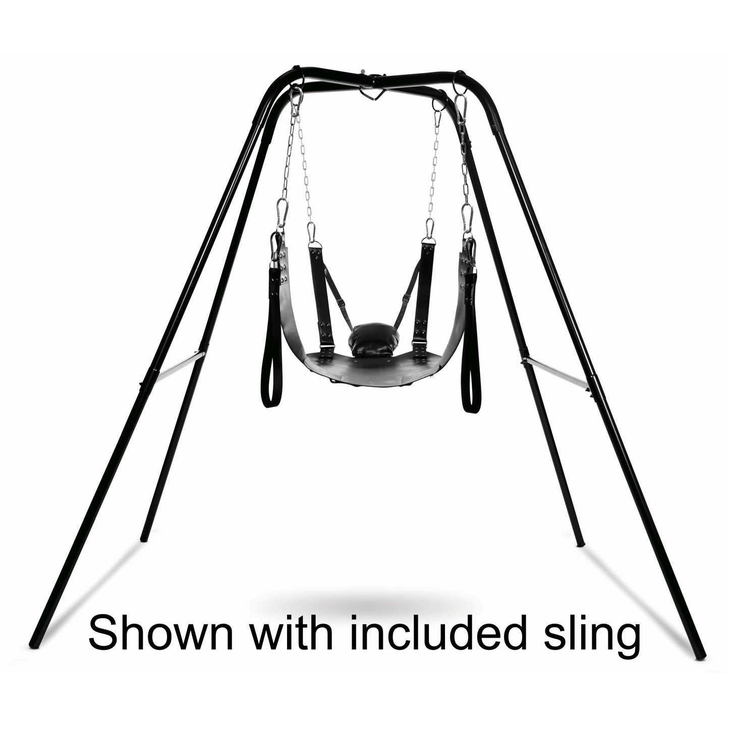 Note: Weight limit of 300 pounds. Includes stand, 4 chains, 8 spring snap clips, leather sling, and 2 removable stirrups. 4 rings are welded to the stand, as well. Standard sex swing compatible, but not included.
