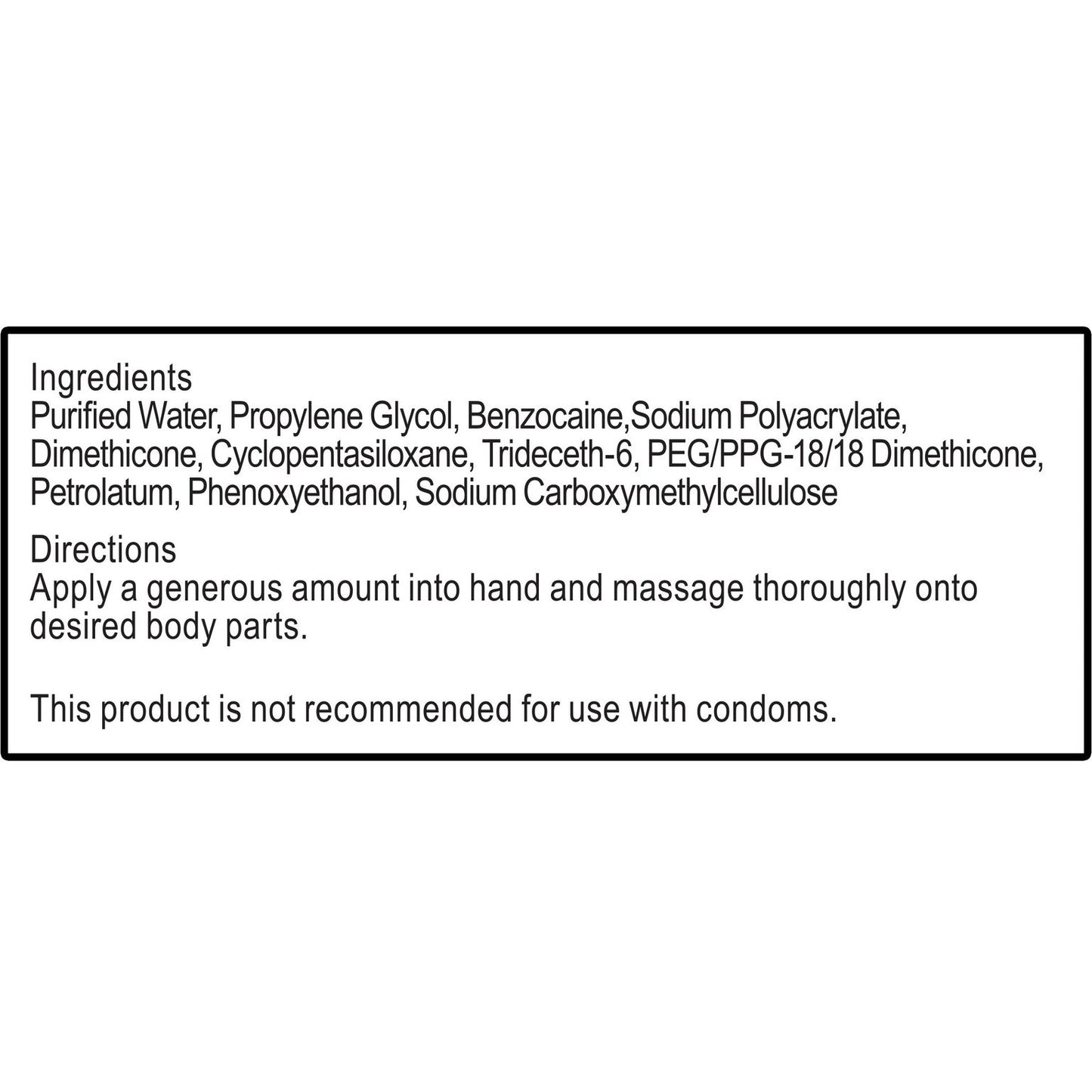 Active Ingredients: Benzocaine 5 percent, Mineral oil, Petroleum