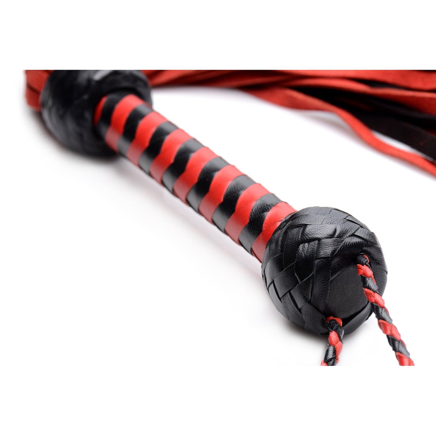 The many tails of this suede flogger will flash red and black as they impact the skin of your masochist. Each strand is supple and soft, but will land with a sting when used properly. The handle is leather tightly wrapped in an elegant black and red herringbone pattern, and features a matching leather wrist loop.