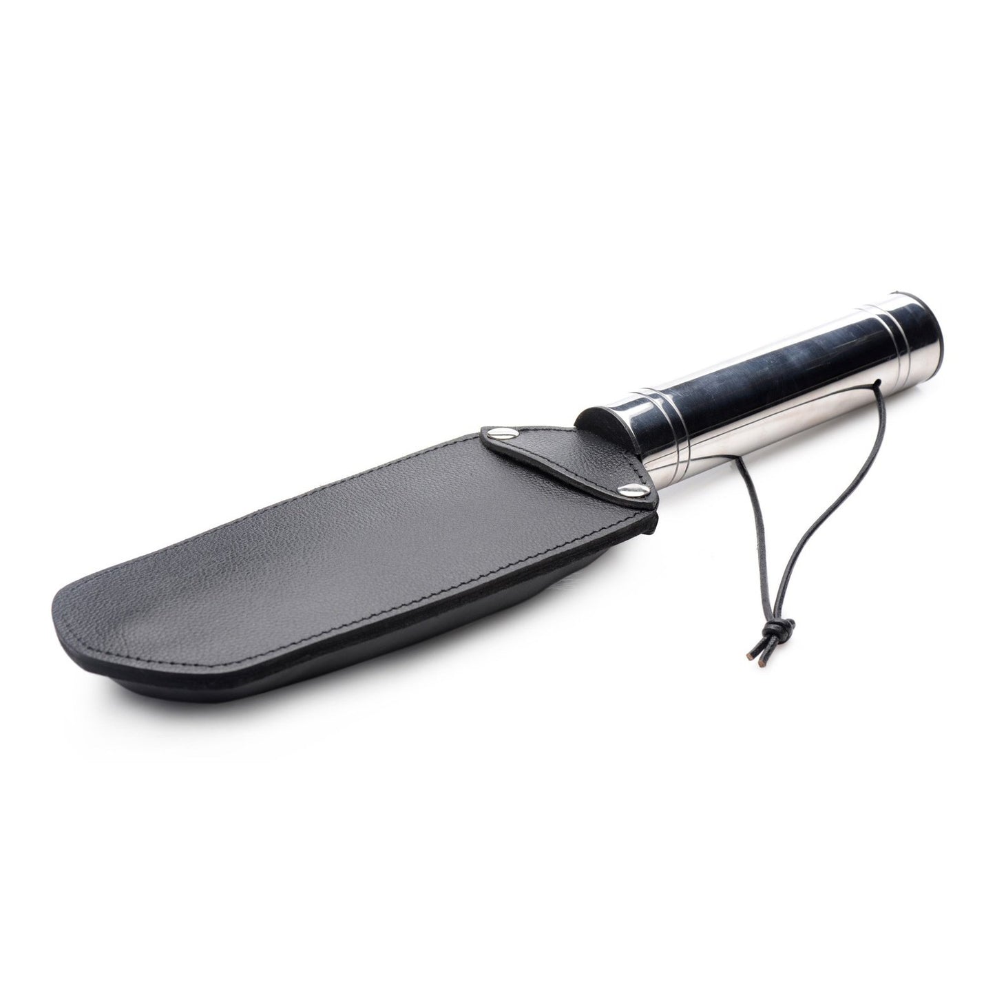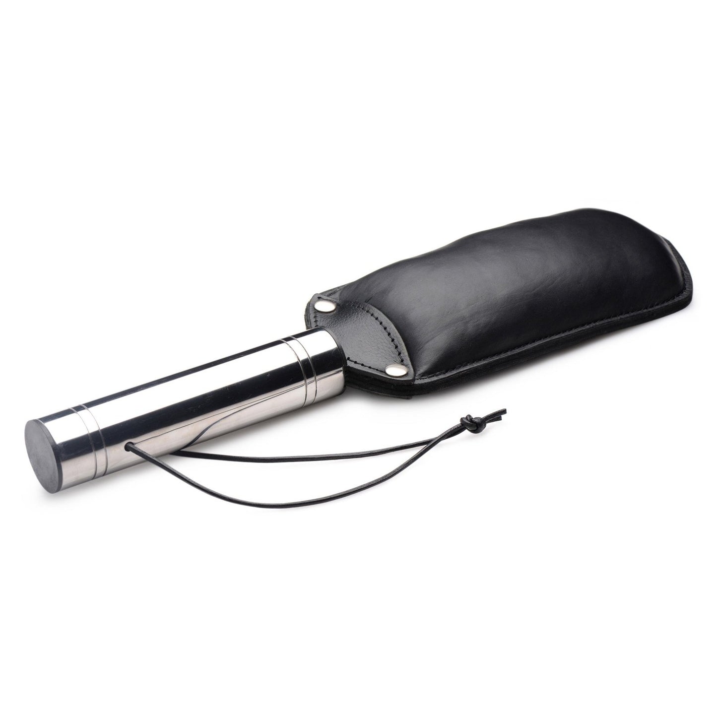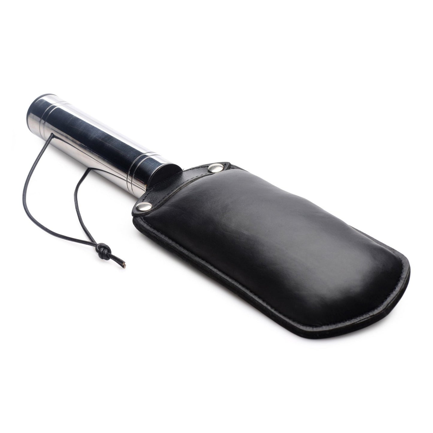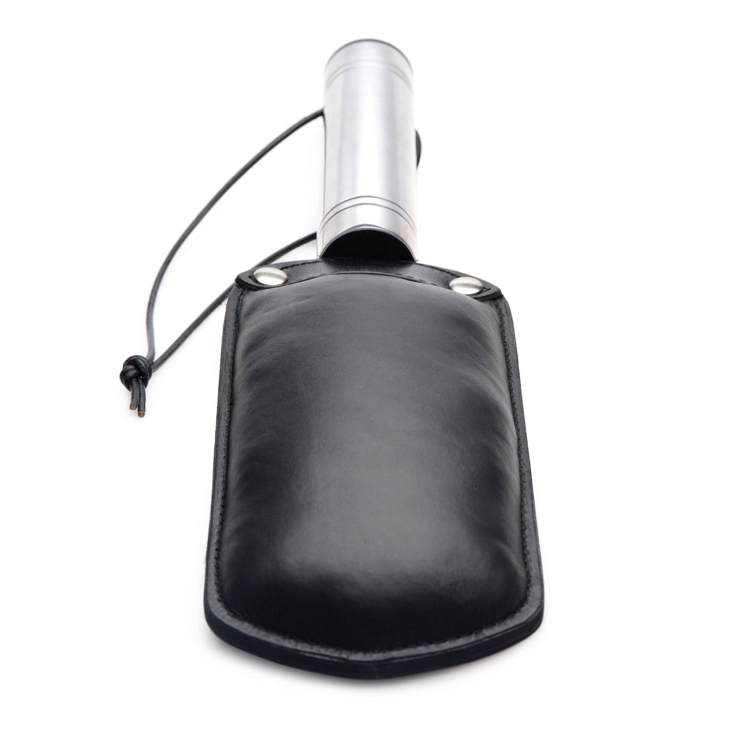 This double-sided paddle can deliver a hard slap, or a soft thud depending on what your plaything deserves. When they are being bad, give them something to whine about with the flat side. When they are being good -- but you still want to make an impact -- flip the paddle around and give them a whack with the padded side. The sturdy, thick leather is no joke! The metal handle adds a cool weight to your control. A loop at the end can be worn around your wrist for more security during use, as well as utilized for hanging storage. There are two sides to every masochist... indulge them both!