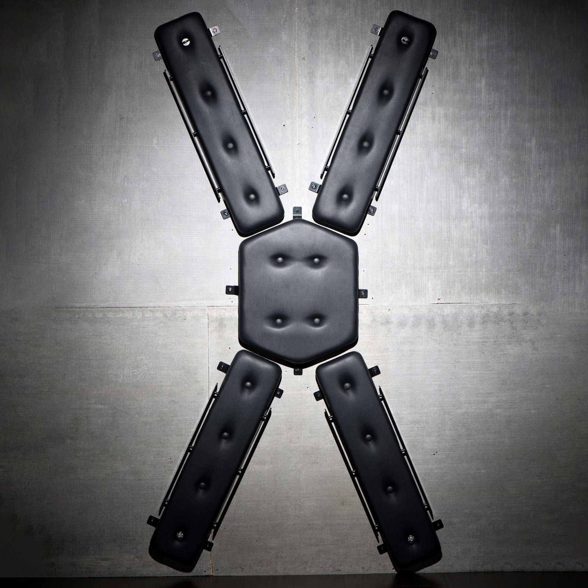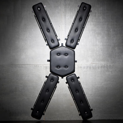 Optimize your kinky play with this wall-mounted St. Andrew's Cross! This plush, padded cross lays flat against the wall so you have more floor space! It's perfect for smaller rooms and gives you more square footage to place other kinky pieces in the room along with the cross. It's also great for rooms that have dual use such as a bedroom where you can hide a cross behind a curtain or dresser. The cross comes in 5 separate pieces and is shipped in a flat package discreetly to your address! Assemble it with the help of a drill and stud finder and place the 5 pieces exactly at the height that you prefer for easy and ergonomic scenes. The ultra plush pads are covered in PVC faux leather, are extra comfortable and easy to clean with a toy cleaner or isopropyl alcohol spray. Along the sides of each leg and arm pad are attachment points where you can attach wrist and ankle cuffs, rope, or other kink accessories! Get your submissive to stand upright for impact play whenever you like with this easy to install, easy to hide and compact St. Andrew's Cross!