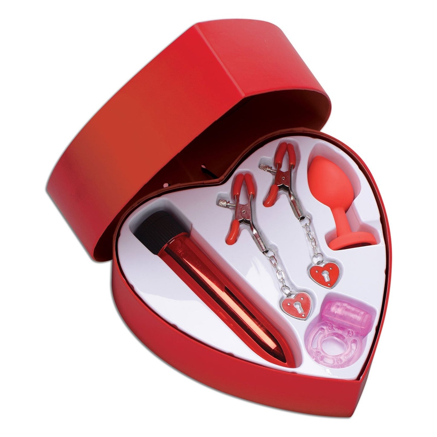 Gift yourself and your lover with this Passionate set of delights! Everything you need for a night of passion is included in this heart shaped box: nipple clamps with heart shaped weights, a powerful multi-speed vibrator, a buzzing cock ring, and a silicone butt plug are waiting for you and a lover to explore and enjoy! Perfect for gifting and sexual exploration for Valentine's day, birthdays or any other special occassion with your lover!
