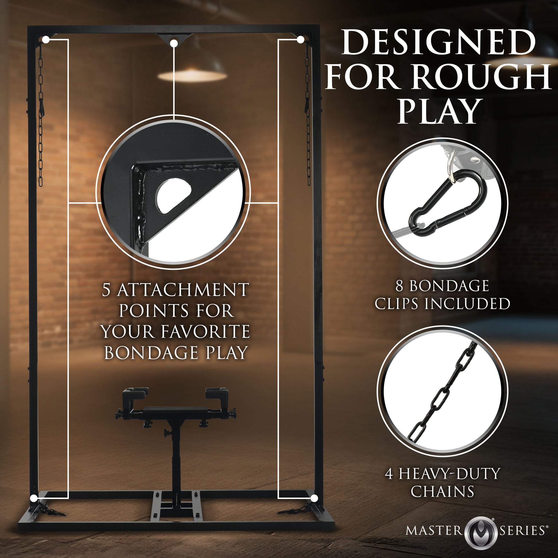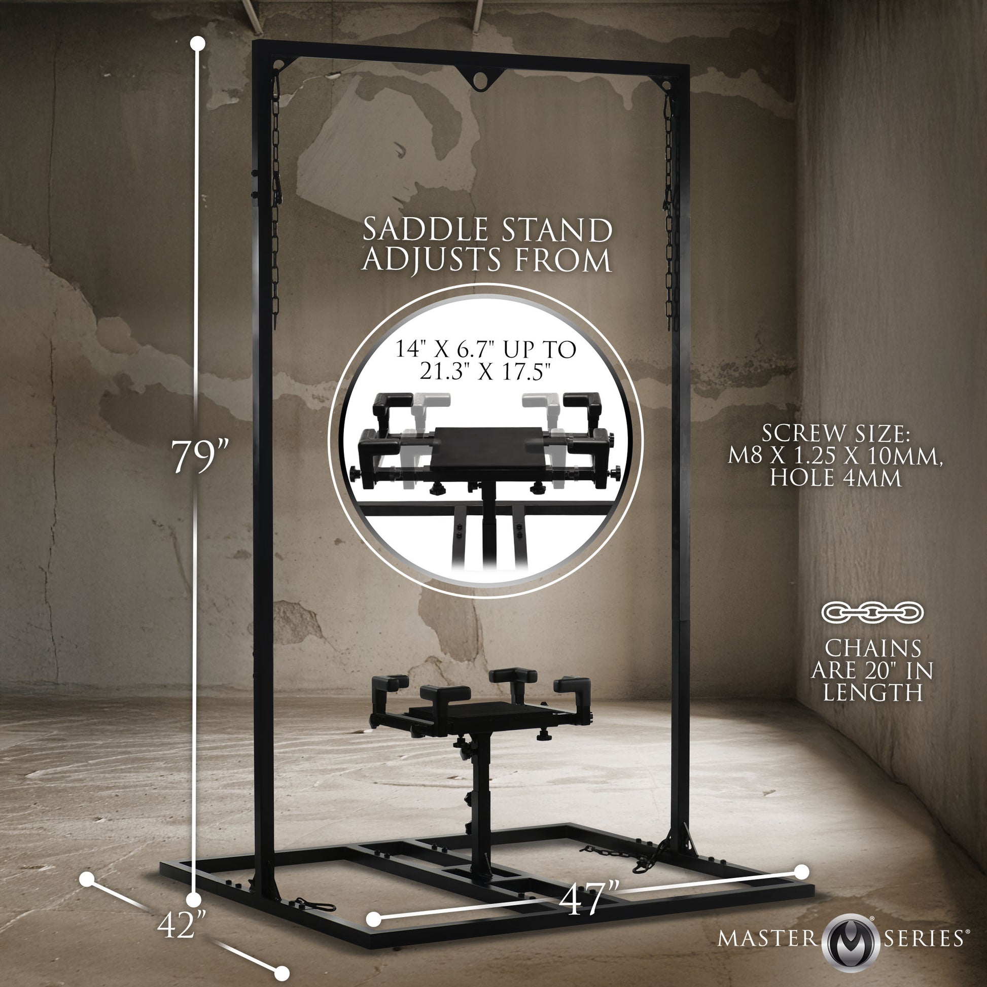 Designed for adventurous users, this sturdy adjustable frame allows standing or elevated positions while using a sex saddle without the need to kneel or bend low. Bring your submissive up to your level and please, punish, tease and tantalize them all while they are restrained by cuffs and chains to the frame! Built with a heavy-duty steel structure, it can handle extremely kinky sessions while offering maximum stability. Featuring 5 attachment points for wrist and ankle cuffs, along with chains and clips included, it’s perfect for fully customizable setups that give you the freedom to dominate the way you want. Lock the sex saddle in place, have them get on top, then restrain them so they can't wriggle free! They will ha to submit completely to intense, erotic scenes while you use other toys, BDSM gear, or kinky tools on them as they recieve uninterrupted pleasure. Compatible with nearly all saddle machines, this is a must-have upgrade for enhanced functionality and long-lasting use.