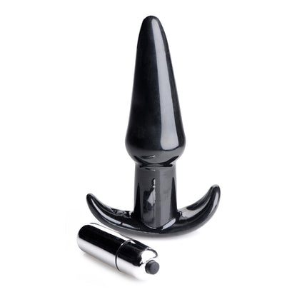 The thrillings thrums of this smooth butt plug are perfect for an anal amateur or a booty boss! A tapered tip coupled with the sleek material allow for a comfortable penetration, while the narrow base is shaped perfectly to fit between your cheeks. A one-speed bullet is included that can be inserted at the bottom of the plug. With the simple push of a button you can fill your hole with humming heaven. It is even waterproof to allow for wet, hot fun in the shower or jacuzzi! This firm, but flexible butt plug is phthalate-free and compatible with silicone and water-based lubricants. Clean with mild soap or a toy cleaner.
