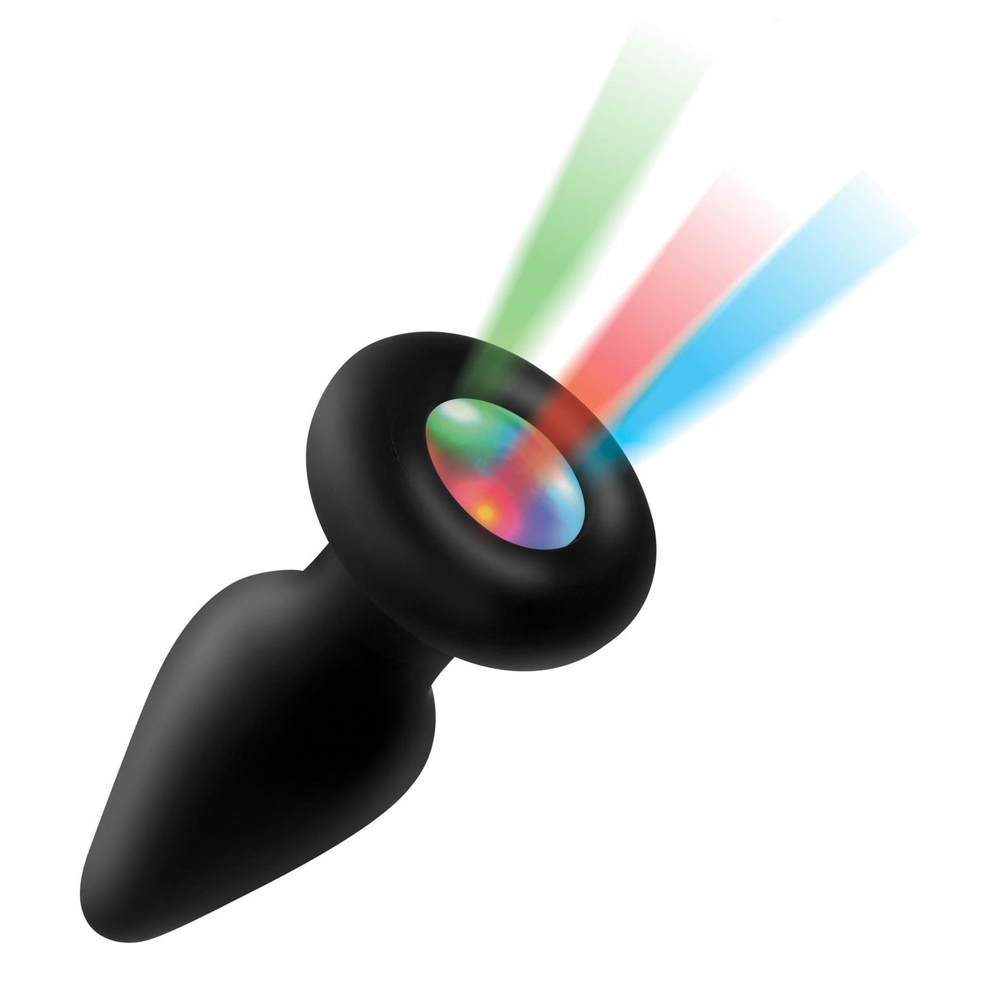 Light up the night with this light-up anal plug! Have some fun with your booty play and give your partner a light-show at the same time. This silicone anal plug has an LED light that shines red, green and blue and switches between 3 different light patterns! Find your partner in the dark or play some music that matches the pulsing beat of the LED light-show!