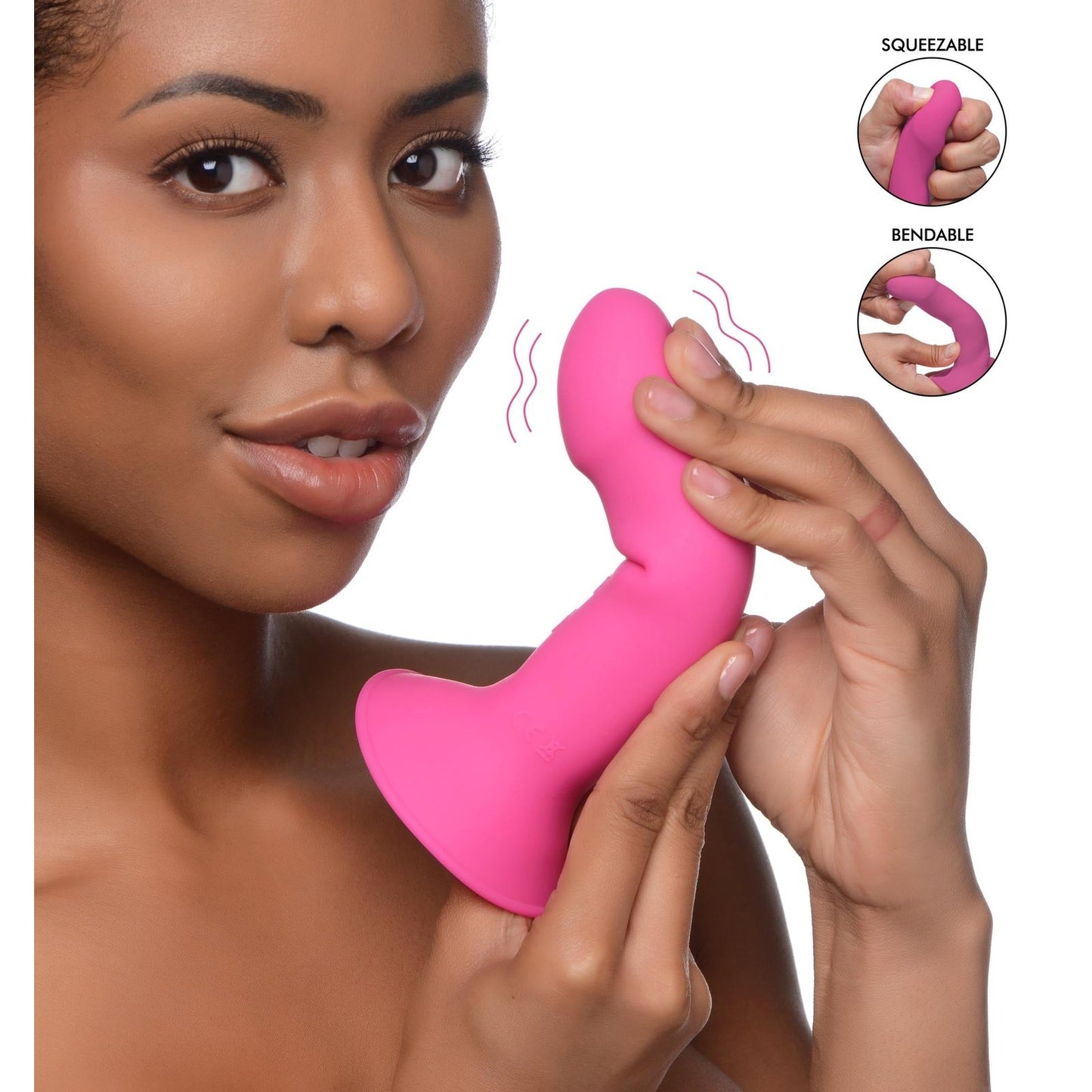 Squeeze your way into pleasure with these vibrating, squeezable dildos! Thermo-reactive, they soften up and become more flexible as they warm up to your body temperature. Enjoy how the curves easily reach your sensitive prostate or G-spots! In addition to being a flexible, premium grade silicone dildo, enjoy 3 speeds and 7 patterns of vibration rumbling through the shaft!