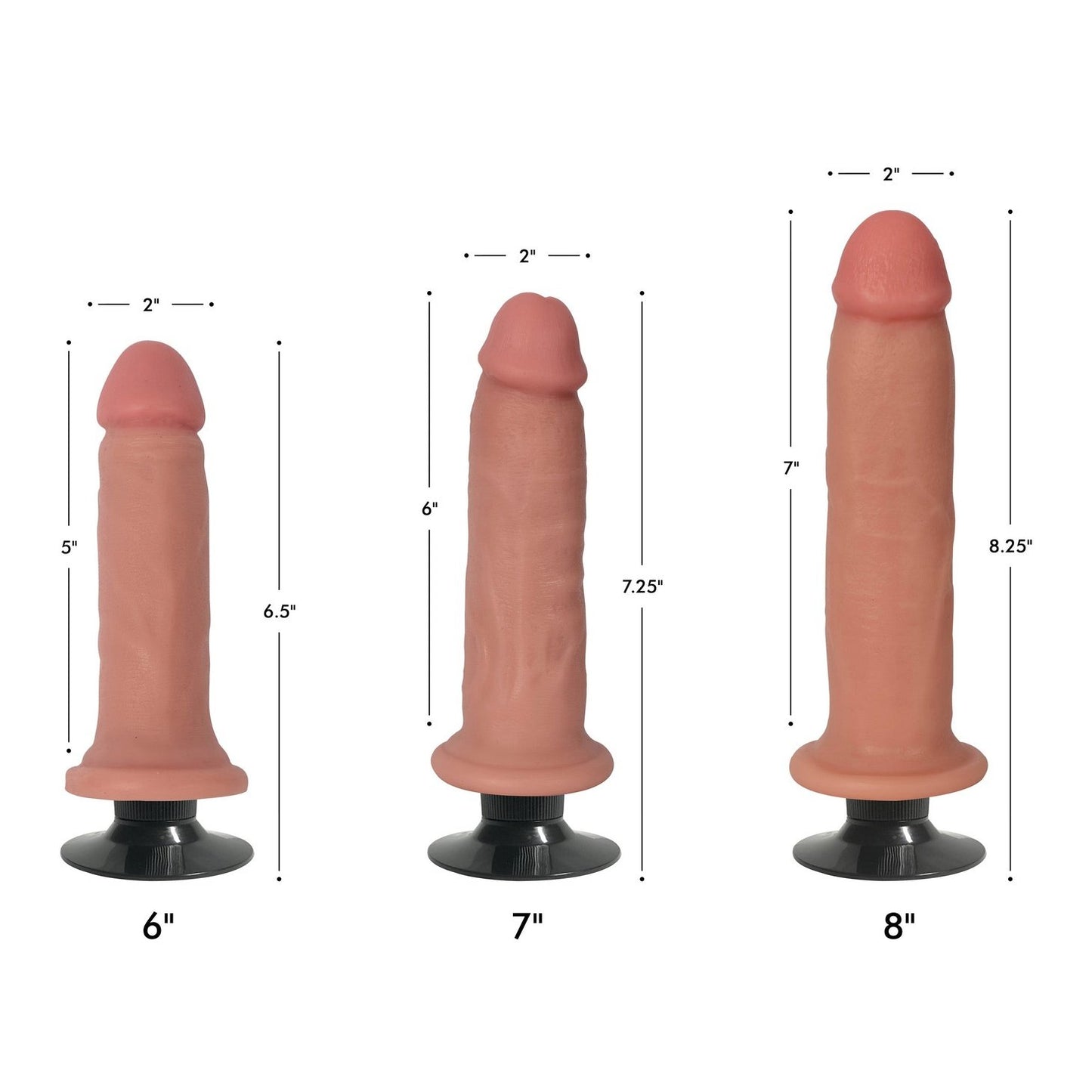 Each dildo is hand crafted with ultra-realistic Bareskin Material that mimics the looks and density of real dick - purposefully formulated to mimic more expensive dual density dildos without the weight and price tag! Enjoy the subtle veins and defined head, and rub your nub against the especially meaty ballsack at the base of these suction cup shafts.