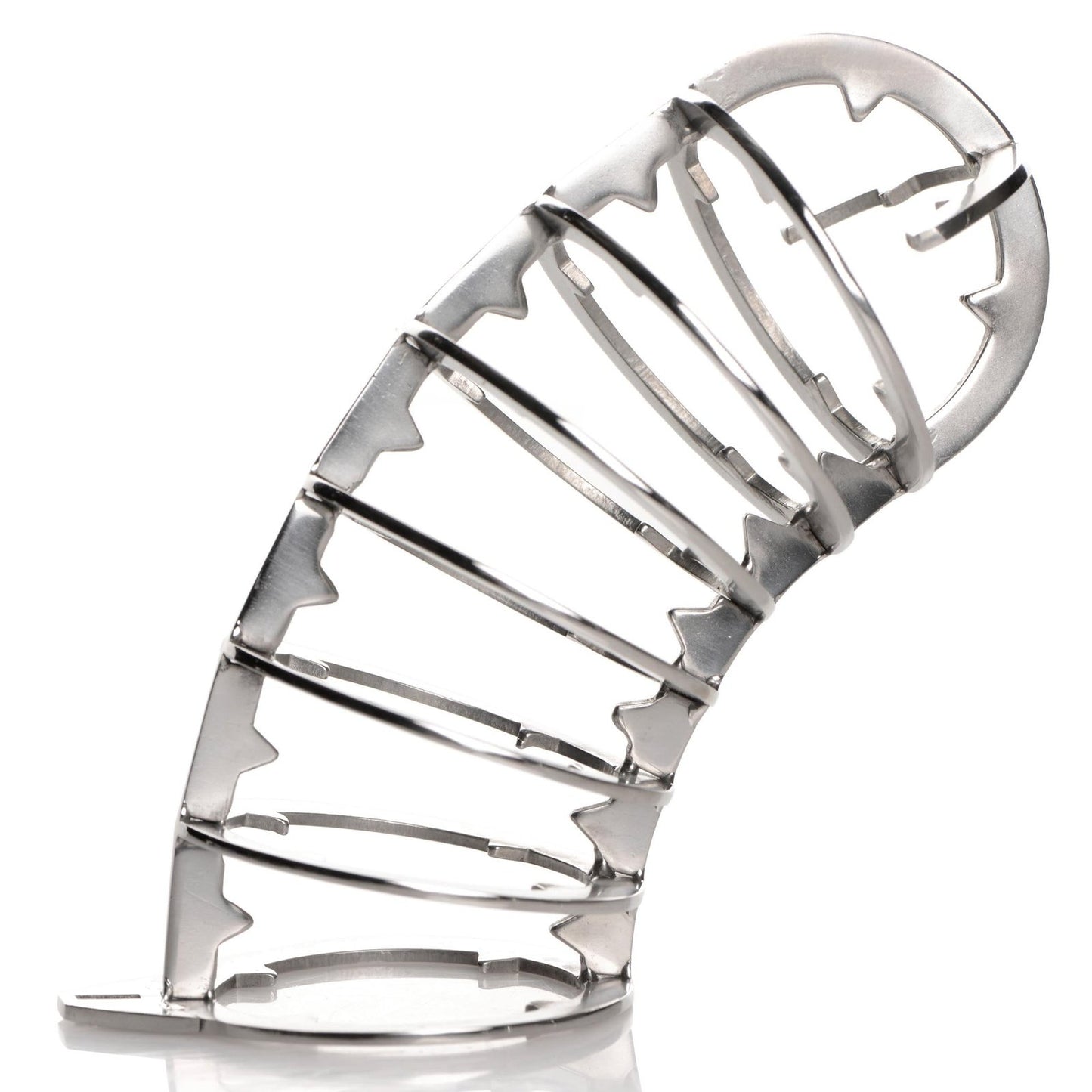 This sinister Spiked Chastity Cage is a penis prison built for the most deviant of submissives. Made of cold, hard steel, it is non-porous, durable and difficult to escape! The spine of the cage has devilish rings that bear 4 spikes each, evenly spaced, so you can feel their pointed prick pressing into your naughty erection, immediately correcting an unapproved moment of excitement. The base is built similarly to a pair of metal handcuffs; it is circular with a hinge at the center and many, rectangular slats that line up so you can lock it in place securely. Use the flat, flanged pin to slide into the slats once you discover the right fit, and then use the lock provided to lock it into place. This cage includes 2 keys along with the lock and cage and a small, black, velvet bag for storage.