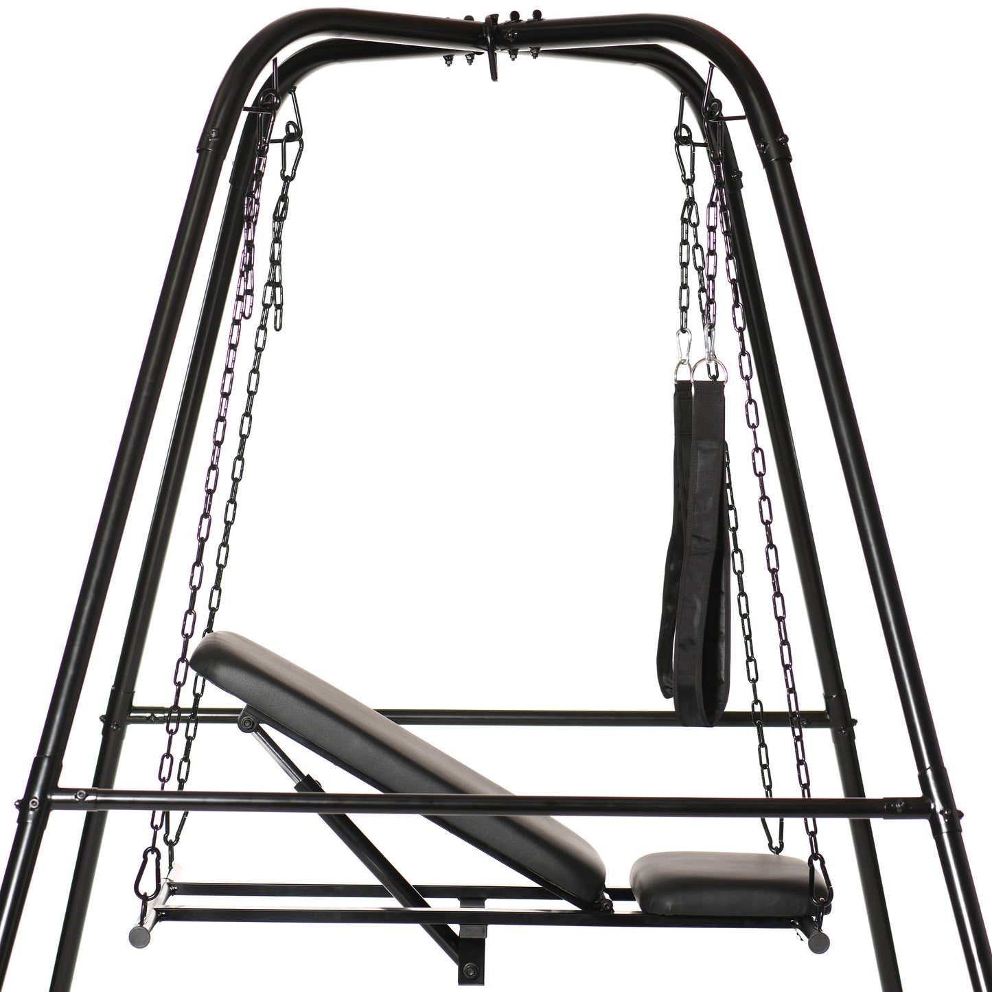 This swing is unlike others. For those who want support and a padded but firm surface, this swing is a floating chair or bondage table that makes your experience weightless. As you defy gravity and push the edges of your kinky comfort zone in intense or stimulating scenes, find yourself securely above the ground on this chair swing suspended from a durable, steel frame that can hold up to 330 lbs. The chair hangs via chains from the easy to assemble frame. Stirrups are included and allow you to elevate your legs or grab on with your hands, depending on your position. Fully adjust the height so your partner can enjoy ergonomic penetration and play! Adjust the angle of the chair from 90 degrees to 180 degrees to go from sitting up to laying back and find which angle gives you the perfect angle to hit your A-spot, G-spot or P-spot! The comfortable, padded chair is covered with vegan friendly, easy to clean, vegan leather.