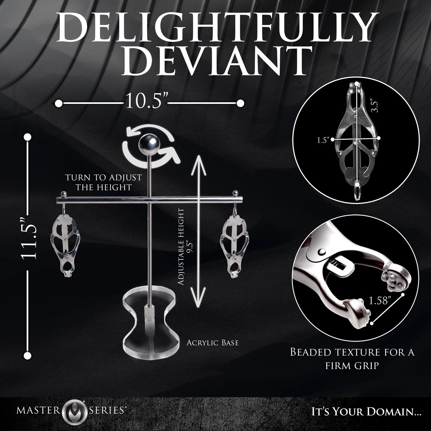 Put your submissive in a predicament: they can't escape with this Tower of Pain! This tower has clover-style nipple-clamps that increase in pressure when they're pulled on. The rubber tips protect the skin of the nipples and areola, but the pressure is wicked! The tower also adjusts in height so you can find the perfect height to torment them with! Made out of stainless steel, it is nickel-free and perfect for sensitive skin. The clear plastic acrylic pad sits between the nipples on their chest as a steady platform. It breaks down easily for storage or travel and can be cleaned with warm water and mild soap or a gentle cleaning solution.