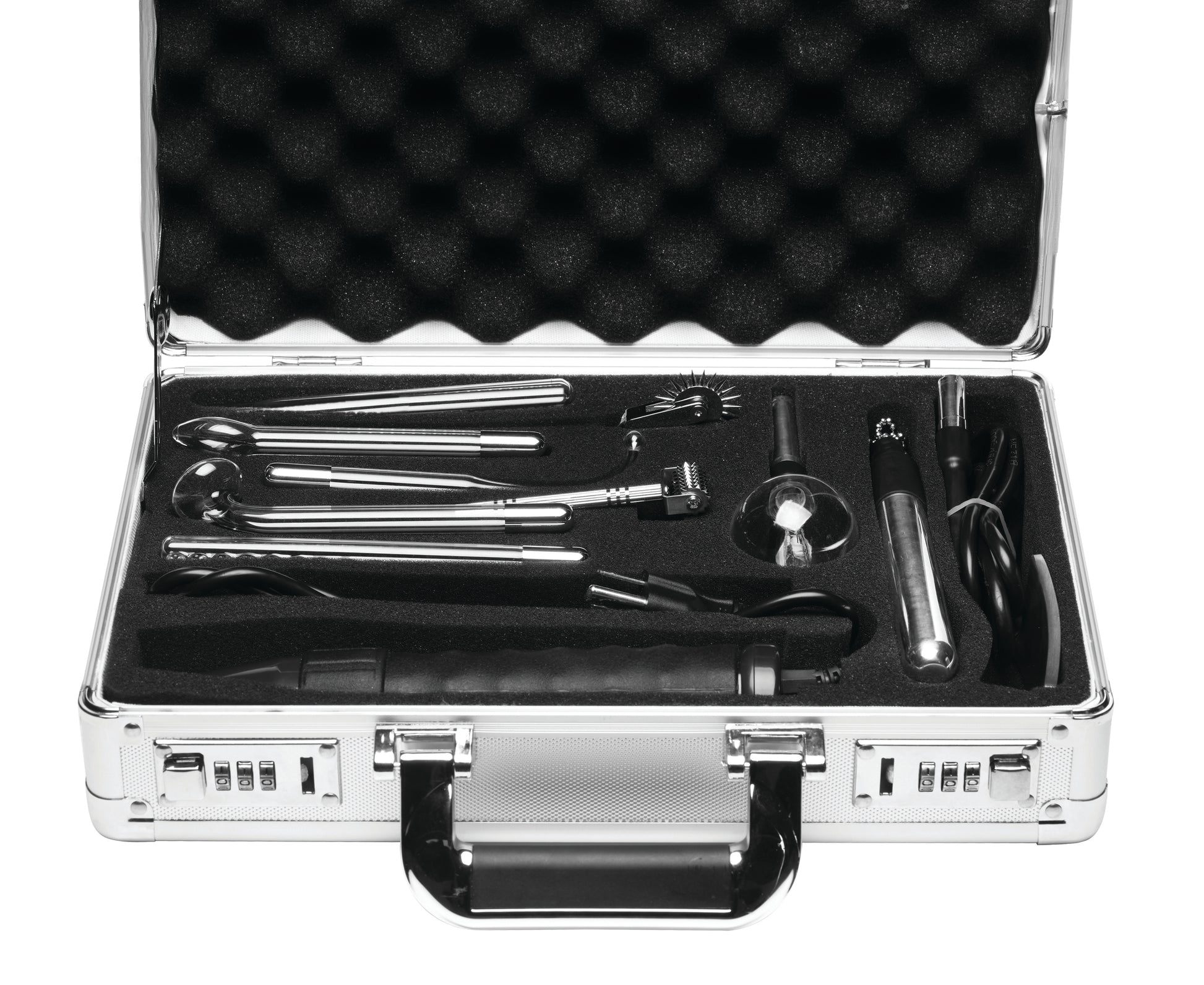 Amaze your partner with visual and sensational delights! Dive into thrilling sensations with this complete violet wand kit designed for electrifying fun. Packed securely in a sturdy metal aluminum and wood case, it includes everything you need to create an unforgettable and electrifying scene. Experience the mesmerizing purple glow emitted from each of these classic violet wand shapes! Explore the unique sensations of each electrode and try out the comb, mushroom, pinpoint, spoon, balltip, and plasma globe. Enjoy the steady, strong electric current of these solid-state wands for smooth, uninterrupted play. Adjust the intensity to cater to each person you play with. Go beyond the glowing glass and elevate your experience with conductive metallic tools like the Wartenberg wheel, Rollenstein, and ball chain flogger. Get intimate and use the body contact plate, allowing your entire body to transmit tingling electricity with every touch. Just plug in and play—no power box needed!